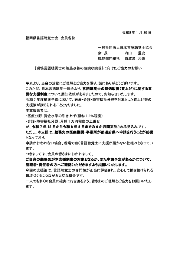 『現場言語聴覚士の処遇改善の確実な実現』に向けたご協力のお願い
