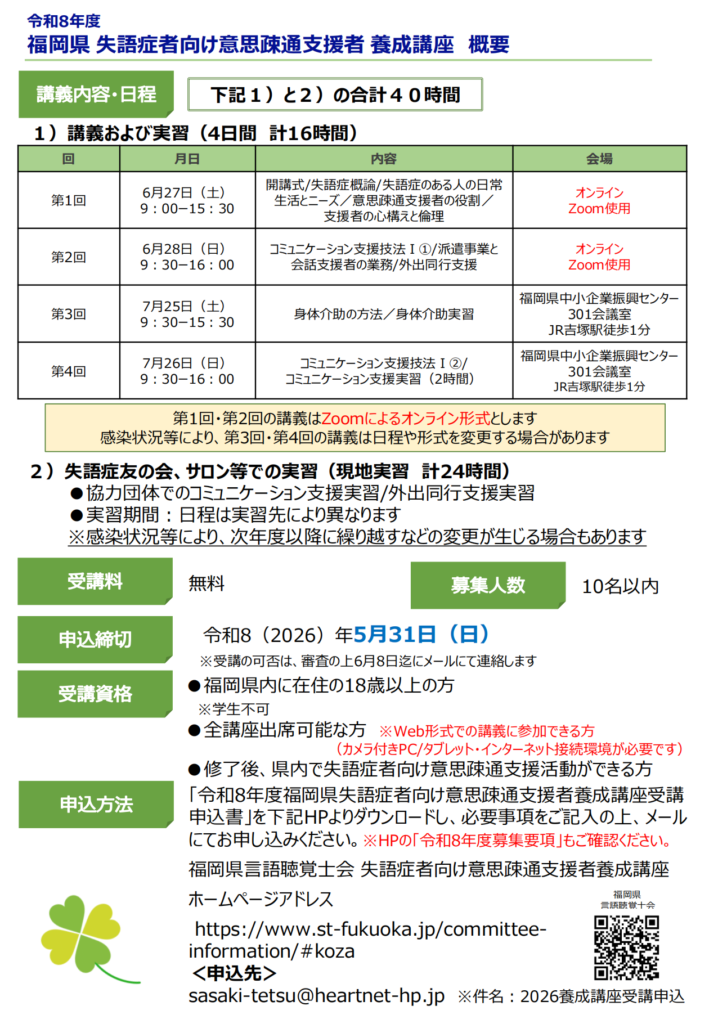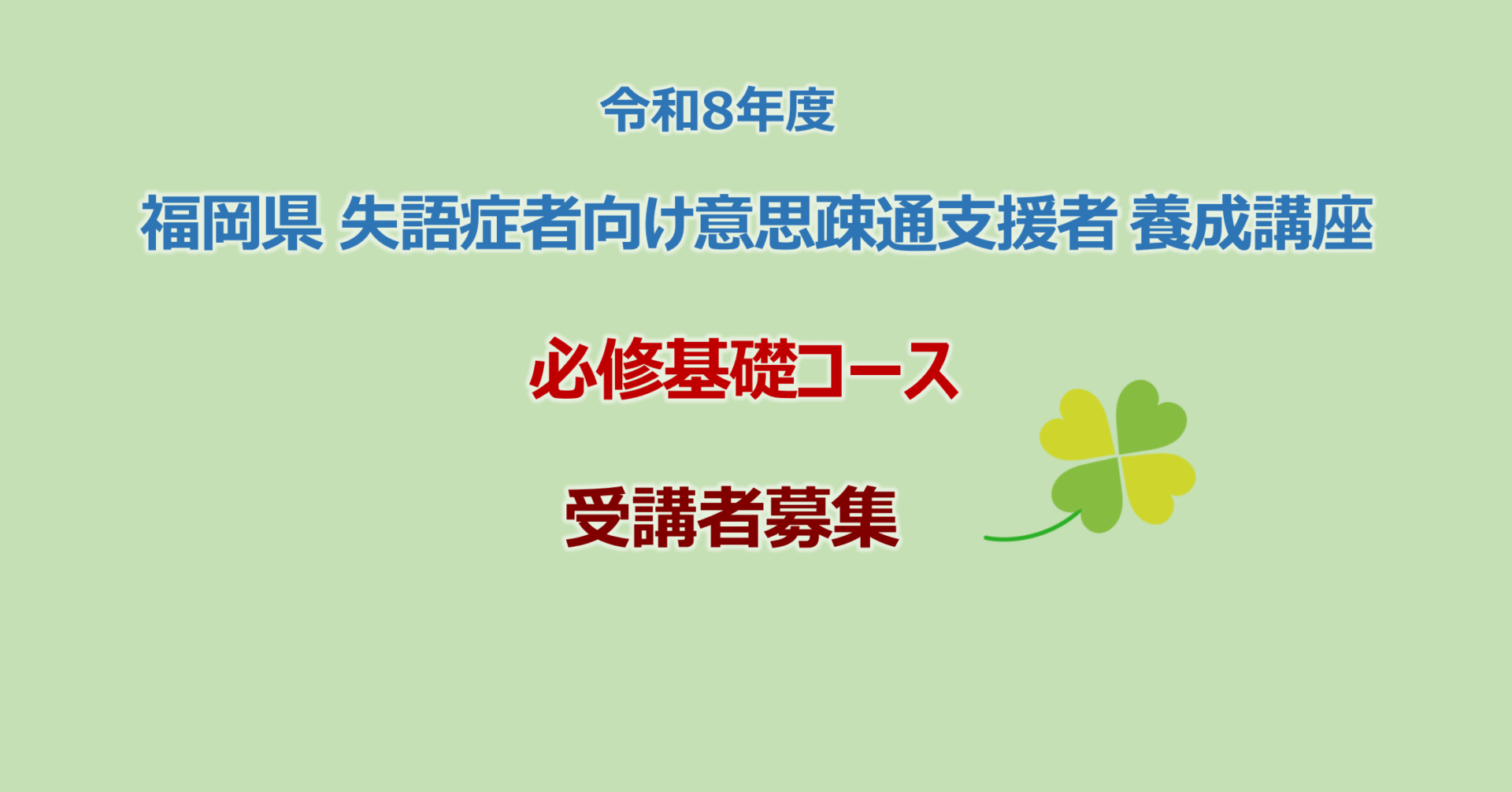 令和8年度 福岡県失語症者向け意思疎通支援者 養成講座 投稿日 2026-04-29 著者 wakisaka カテゴリー 一般 ▶︎▶︎募集要項 word▶︎▶︎応募用紙 excel この記事を書いた人 wakisaka 記事一覧