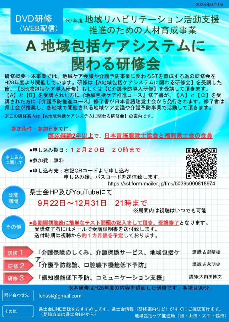 R7年度 地域リハビリテーション活動支援推進のための人材育成事業 投稿日 2025-09-15 著者 funaki カテゴリー 一般 Warning: Undefined array key "file" in /home/c6452020/public_html/st-fukuoka.jp/wp-includes/media.php on line 1774 A 地域包括ケアシステムに関わる研修会 >>詳細はコチラ この記事を書いた人 funaki 記事一覧