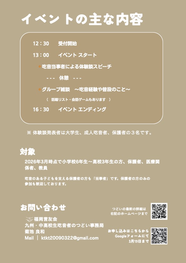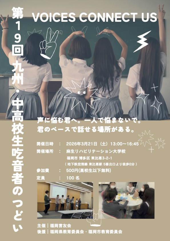 第19回九州・中高校生 吃音者のつどい 投稿日 2025-12-04 著者 funaki カテゴリー 一般 カテゴリー 会員 カテゴリー 学生・新人 カテゴリー 最新情報 この記事を書いた人 funaki 記事一覧