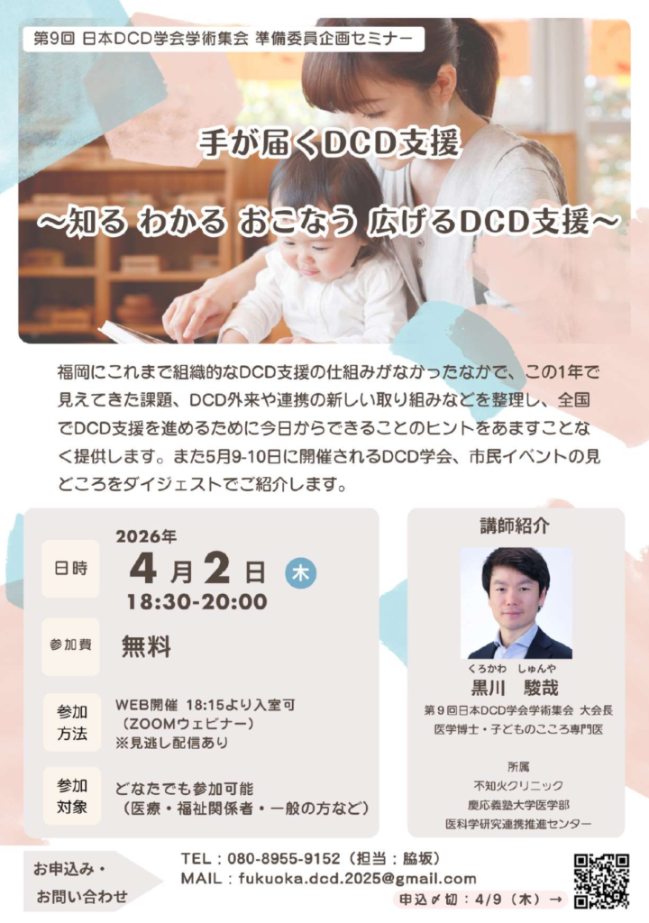 大会に先立ち、下記の通り無料のオンライン勉強会を開催いたします。これまで毎月1回専門家を招いて開催してきたDCDについての基本的な知識や支援についての総まとめを行います。福岡におけるDCD支援の現状と課題、連携の新しい取り組みを整理し、実践的なヒントをお届けする内容です。大会の見どころもダイジェストでご紹介いたしますので、ぜひ貴会会員の皆さまにもお知らせいただけますと幸いです。