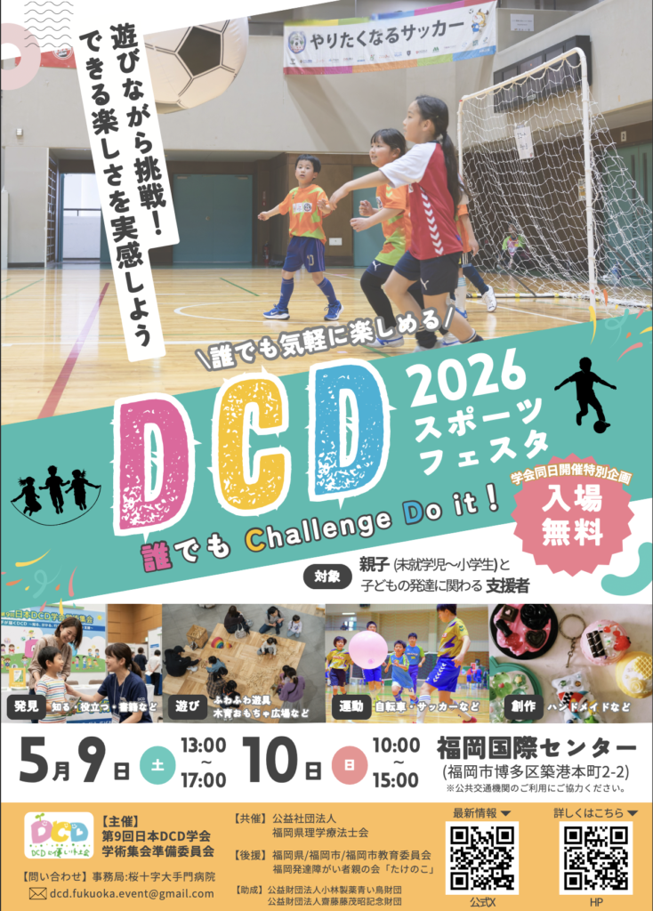 基調講演に岩永竜一郎先生・特別講演に内山登紀夫先生を迎え、さまざまな角度からのシンポジウムに加え、症例報告や事例検討など実践的な企画も充実させています。一般演題登録数も過去最高を記録しました。また、目玉として、学術集会と同時に、一般市民向けイベント「DCDスポーツフェスタ」も開催し、DCD当事者・保護者・教育福祉関係者など多様な支援者との接点を広げます。50以上の団体が集まり、さまざまな書籍や療育グッズの展示なども行われ、DCD支援にエビデンスがあるCO-OPアプローチの体験や、インクルーシブサッカー大会も開かれます。福岡という地で、多職種が交わるアットホームな学会に、ぜひご参加ください。