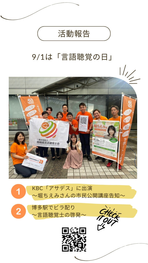 9月1日は「言語聴覚の日」活動報告 投稿日 2025-09-05 著者 funaki カテゴリー 一般 カテゴリー 会員 カテゴリー 学生・新人 カテゴリー 最新情報 この記事を書いた人 funaki 記事一覧